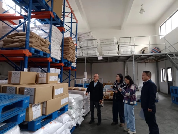 徐國增(左一)和同事現(xiàn)場查看包裝物料管理情況