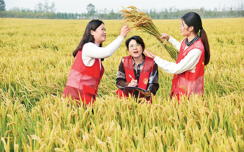 近年來(lái),江蘇省連云港市東??h審計(jì)局為確保豐收糧食儲(chǔ)備安全,以日常檢查和專(zhuān)項(xiàng)審計(jì)檢查相結(jié)合,嚴(yán)審糧油物資儲(chǔ)備臺(tái)賬、實(shí)物庫(kù)存、糧食質(zhì)量、檔案管理等情況。圖為2022年10月21日,東??h審計(jì)局糧食儲(chǔ)備安全專(zhuān)項(xiàng)審計(jì)工作人員在高產(chǎn)稻麥農(nóng)業(yè)產(chǎn)業(yè)園區(qū)檢測(cè)即將豐收的水稻實(shí)產(chǎn)情況。中新社發(fā) 張正友/攝