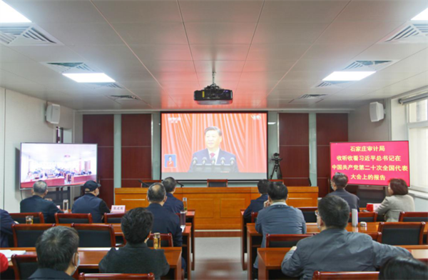 河北省石家莊市審計(jì)局組織黨員干部收聽收看黨的二十大開幕會。全體參會人員認(rèn)真聆聽習(xí)近平總書記的報(bào)告,認(rèn)真記錄、深入領(lǐng)會。同時(shí),組織一線審計(jì)人員在審計(jì)現(xiàn)場、退休審計(jì)干部在家收聽收看。