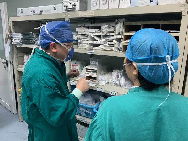 孫藝鵠(左一)在某醫(yī)院耗材庫(kù)房核實(shí)醫(yī)療耗材使用情況