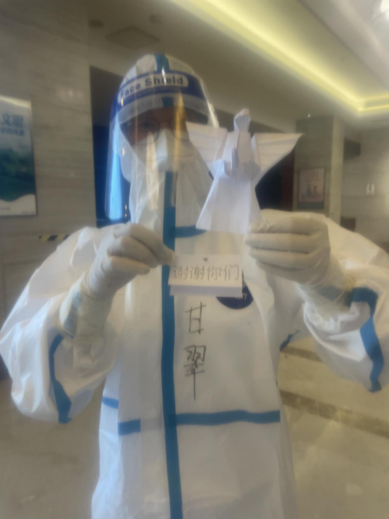 這是南京市江寧區(qū)一處防疫集中隔離點內(nèi),一位被隔離的大學(xué)生送給上門采集核酸的甘翠醫(yī)生的小禮物,收到這份突然而來的特殊禮物,甘醫(yī)生回到生活區(qū)已抑制不住內(nèi)心的激動,眼含深情地對工作組的同志說:“吃再多的辛苦都值,我也要謝謝這些被隔離的人員,更要感謝你們工作組為我們創(chuàng)造了安全的工作環(huán)境和舒適的生活環(huán)境,愿大家都平平安安!”