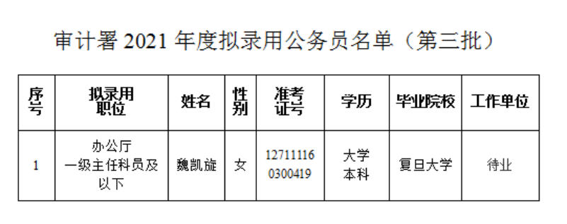 根據(jù)2021年度中央機(jī)關(guān)及其直屬機(jī)構(gòu)考試錄用公務(wù)員工作有關(guān)要求,經(jīng)過筆試、面試、體檢和考察等程序,確定魏凱旋為審計(jì)署擬錄用公務(wù)員,現(xiàn)予以公示。公示期間如有問題,請(qǐng)向?qū)徲?jì)署人事教育司反映。