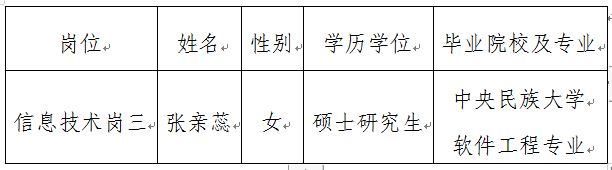 根據(jù)事業(yè)單位公開招聘工作的有關(guān)規(guī)定,現(xiàn)將我單位2019年度下半年公開招聘信息技術(shù)崗三擬聘用人員予以公示。公示期間,如有問題,請(qǐng)向我單位反映,或直接通過中央和國家機(jī)關(guān)所屬事業(yè)單位公開招聘服務(wù)平臺(tái)反映。